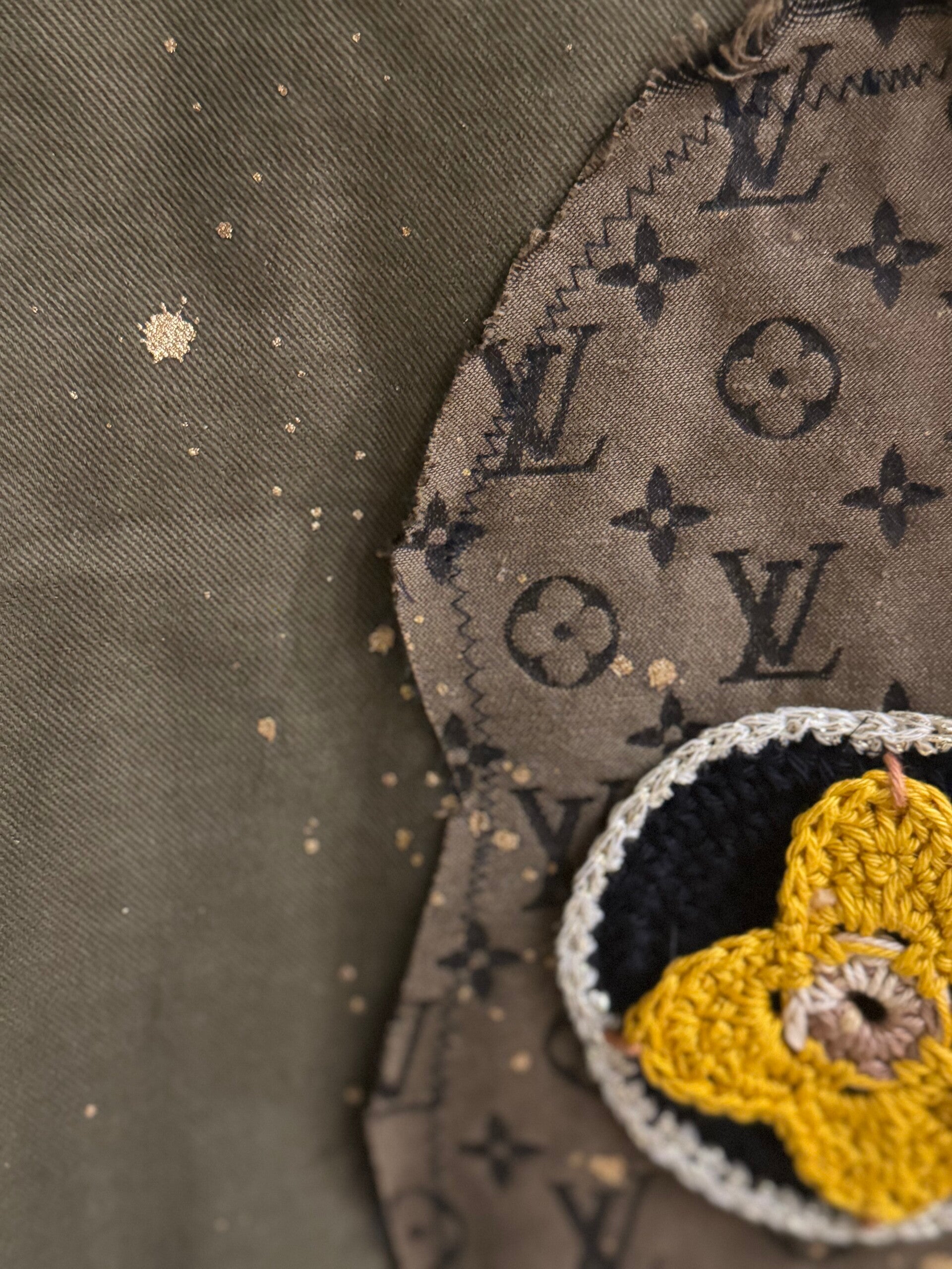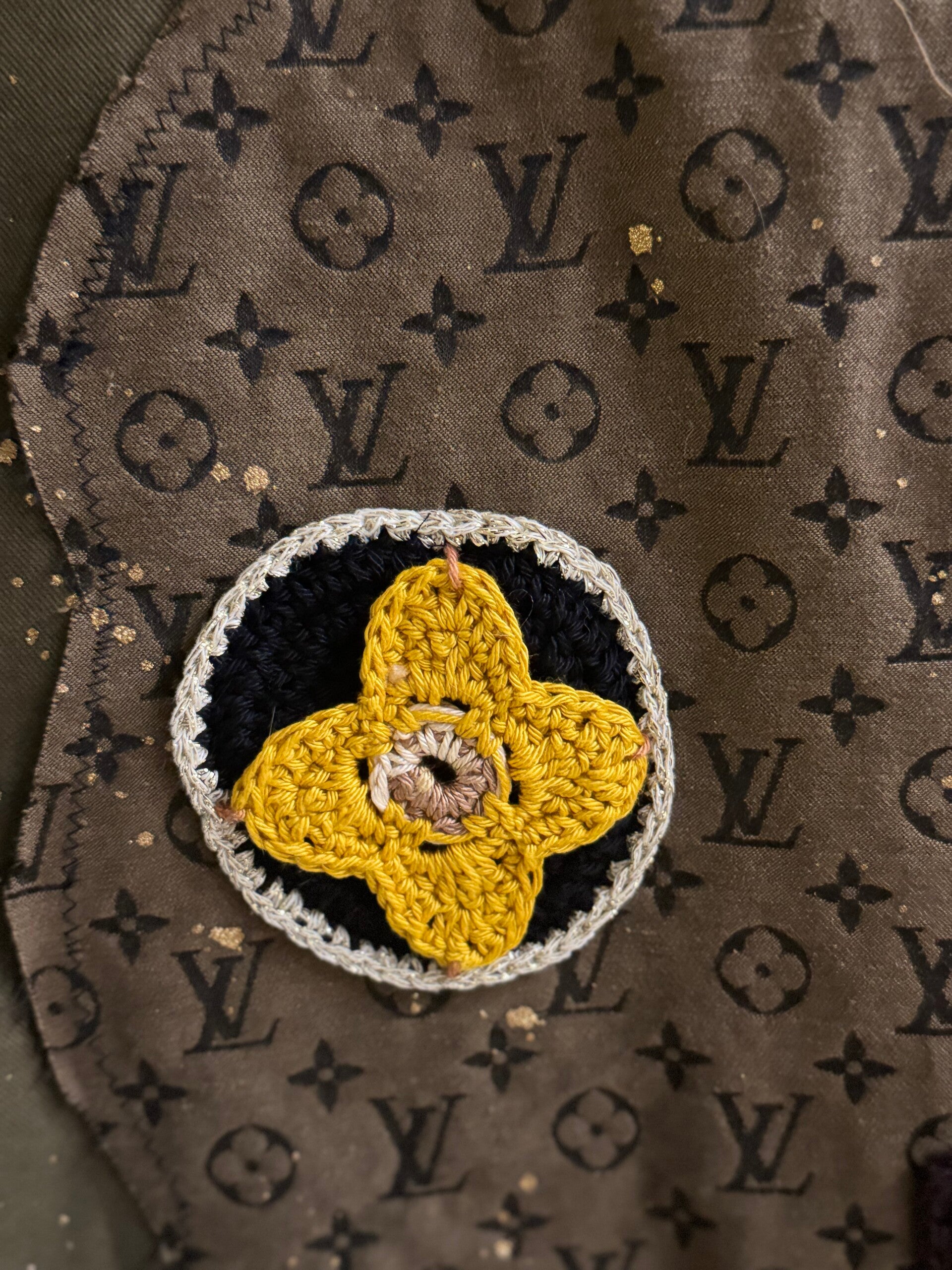 Giacca militare verdina con inserti di cristalli pezzi di tessuto LV upcycling con patch fatte a mano ad unicnetto e piume Marabù.
