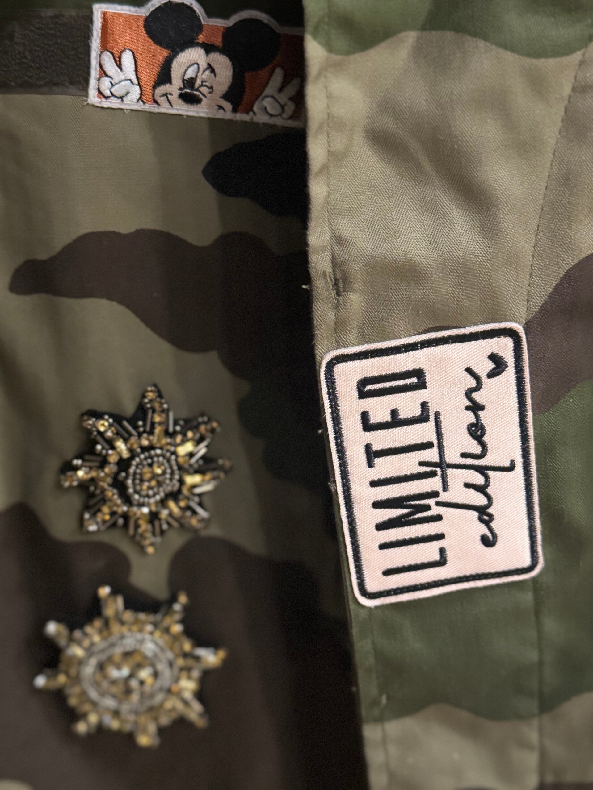Giacca militare "verdina" con inserti di cristalli, fiori, tessuti luxury upcycling e sul retro grande patch luminosa di Topolino.