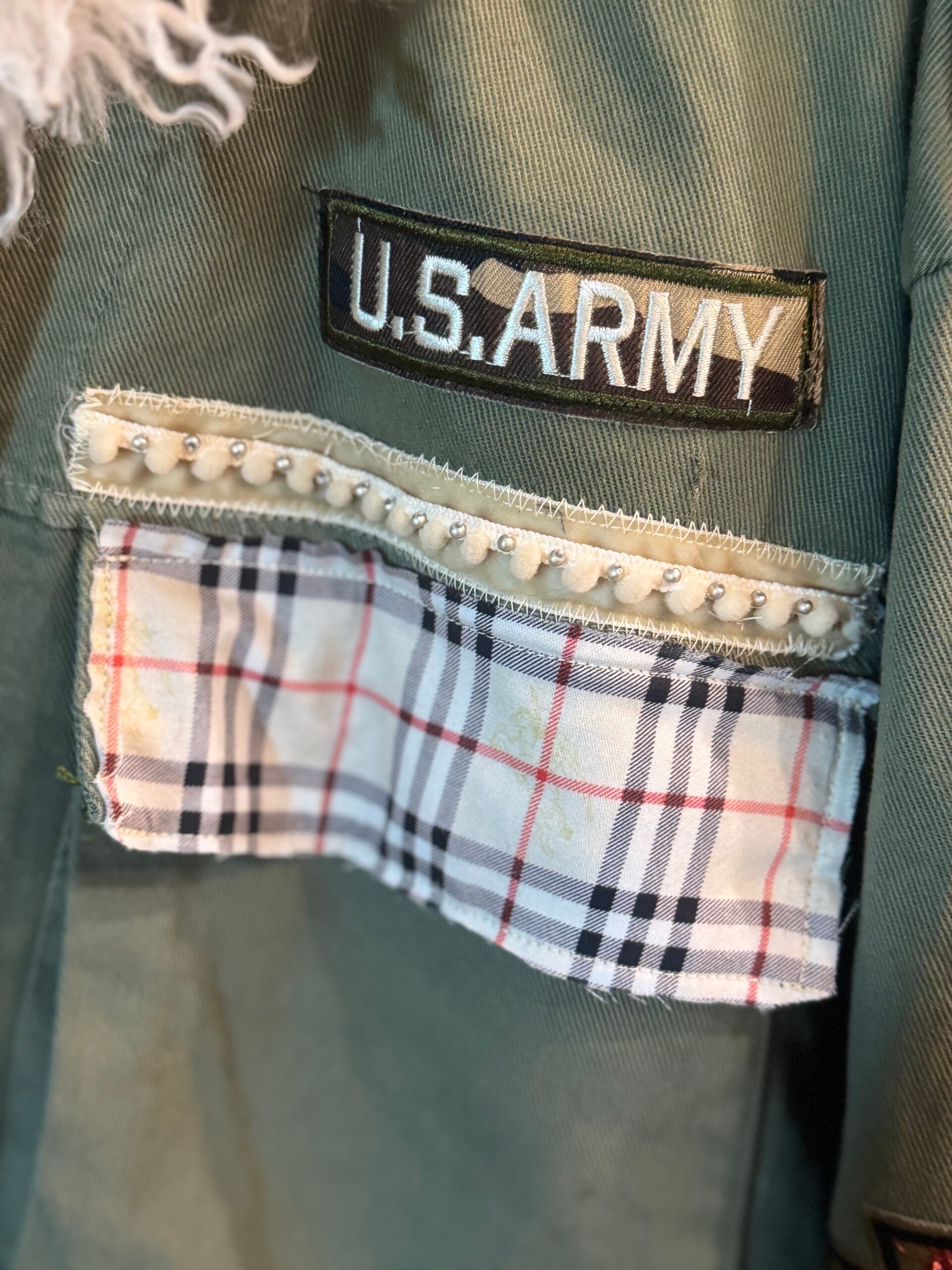 Giacca militare "verdina" con collo in pelo di mongolia color crema, mostrine su spalle argentate insierti tessuto luxury upcycling.