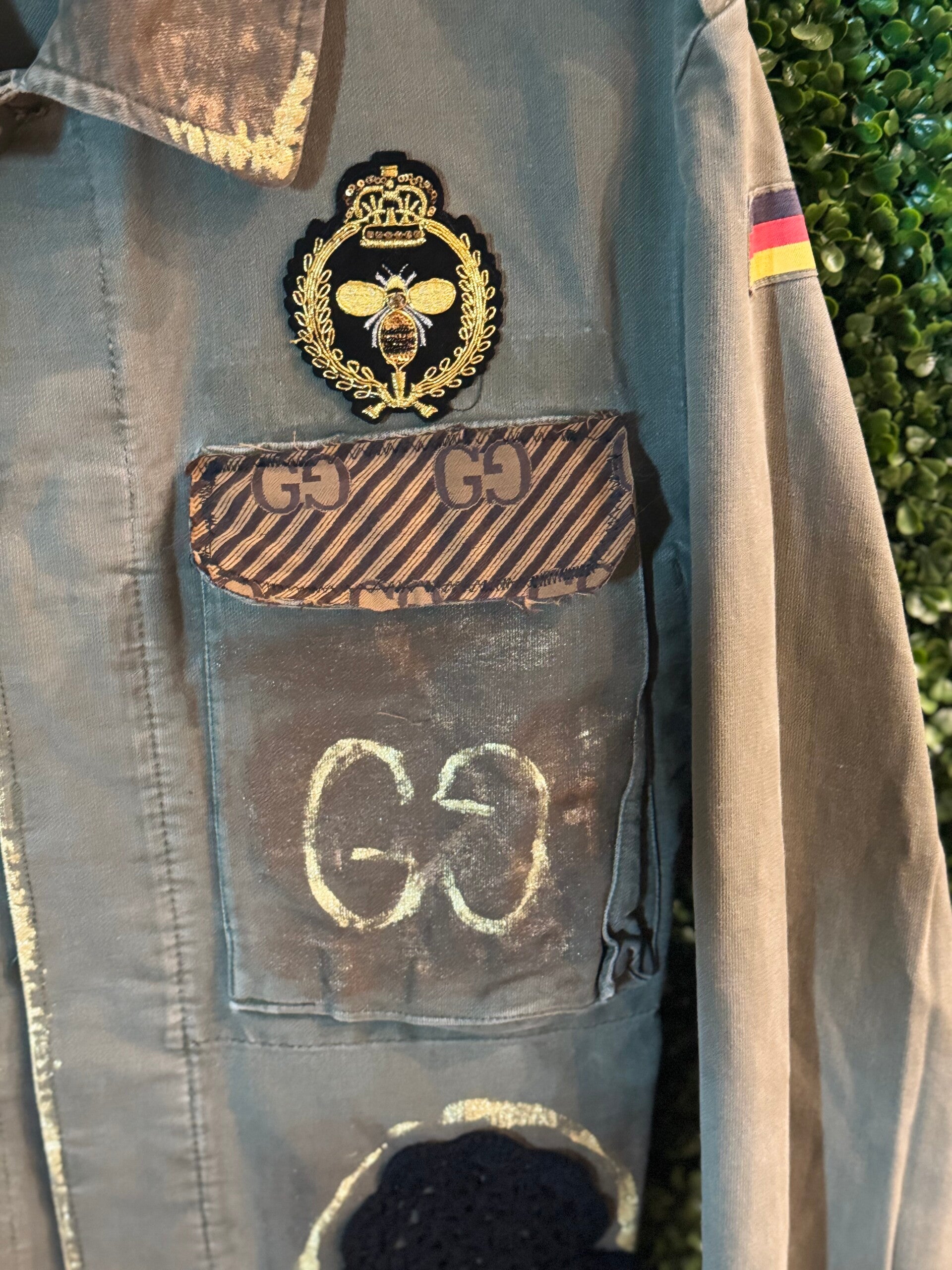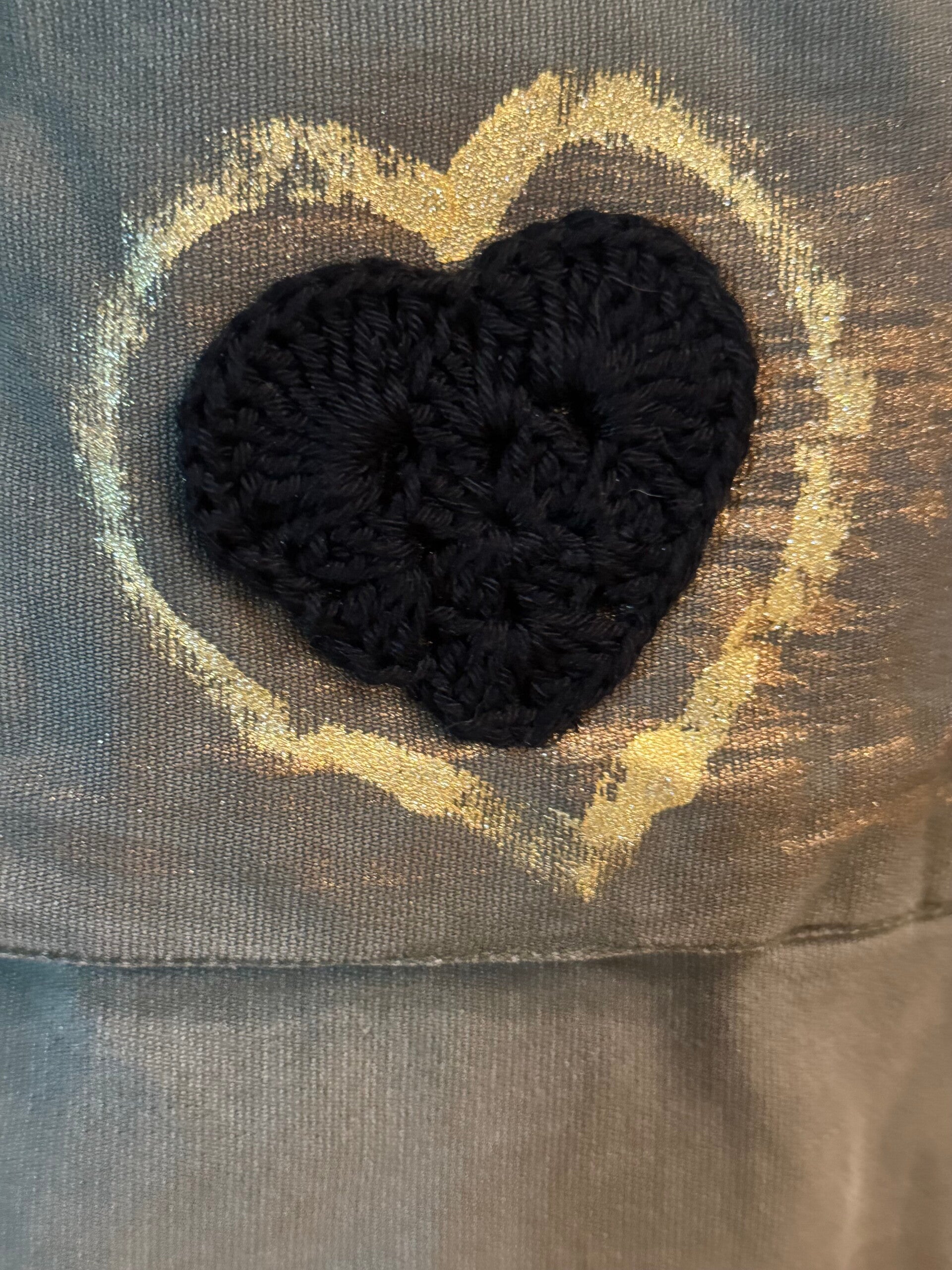 Giacca militare "Verdina" con inserti a forma di cuore fatti a mano ad uncinetto. Tessuto luxury upcycling.