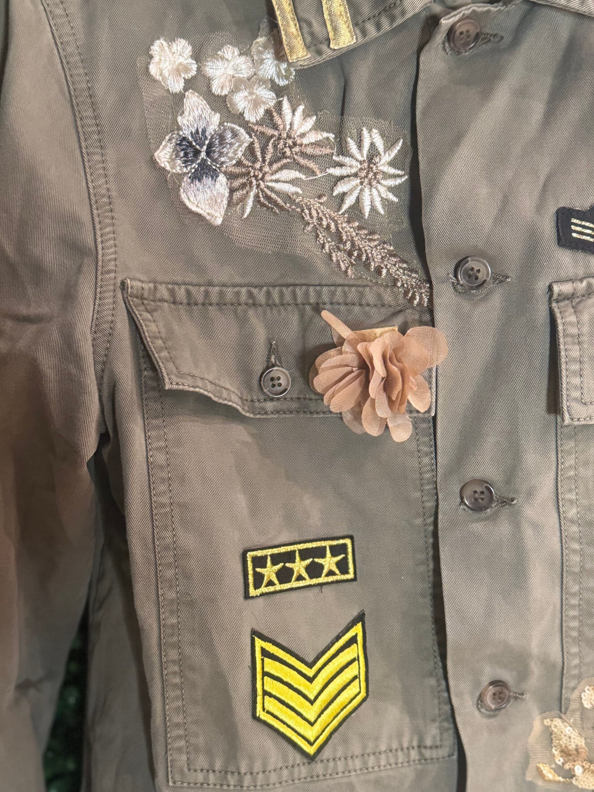 • Decorazioni fatte a mano: fiori ricamati, applicazioni 3D, patch militari fluo e dettagli distintivi AB Pink.