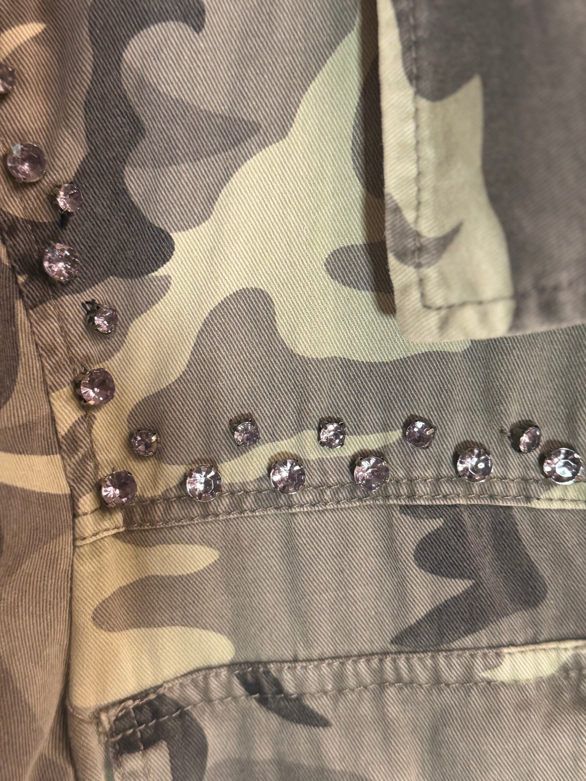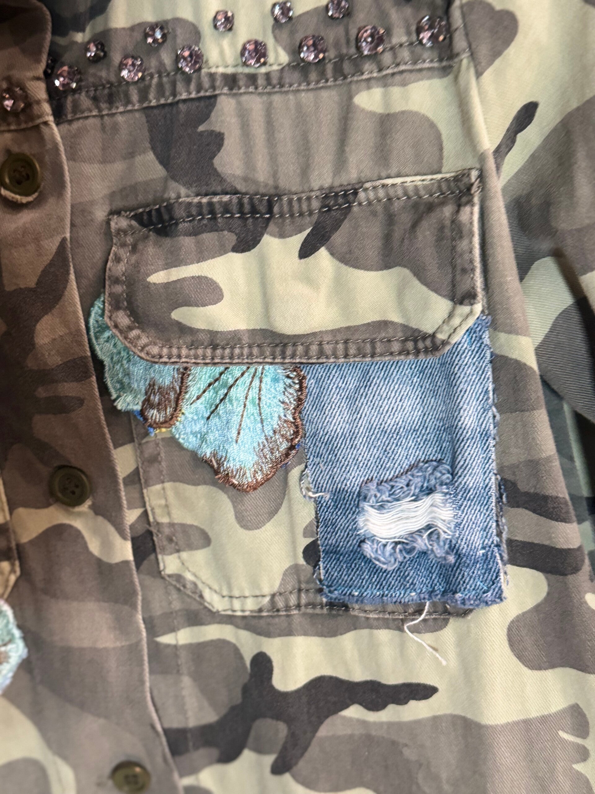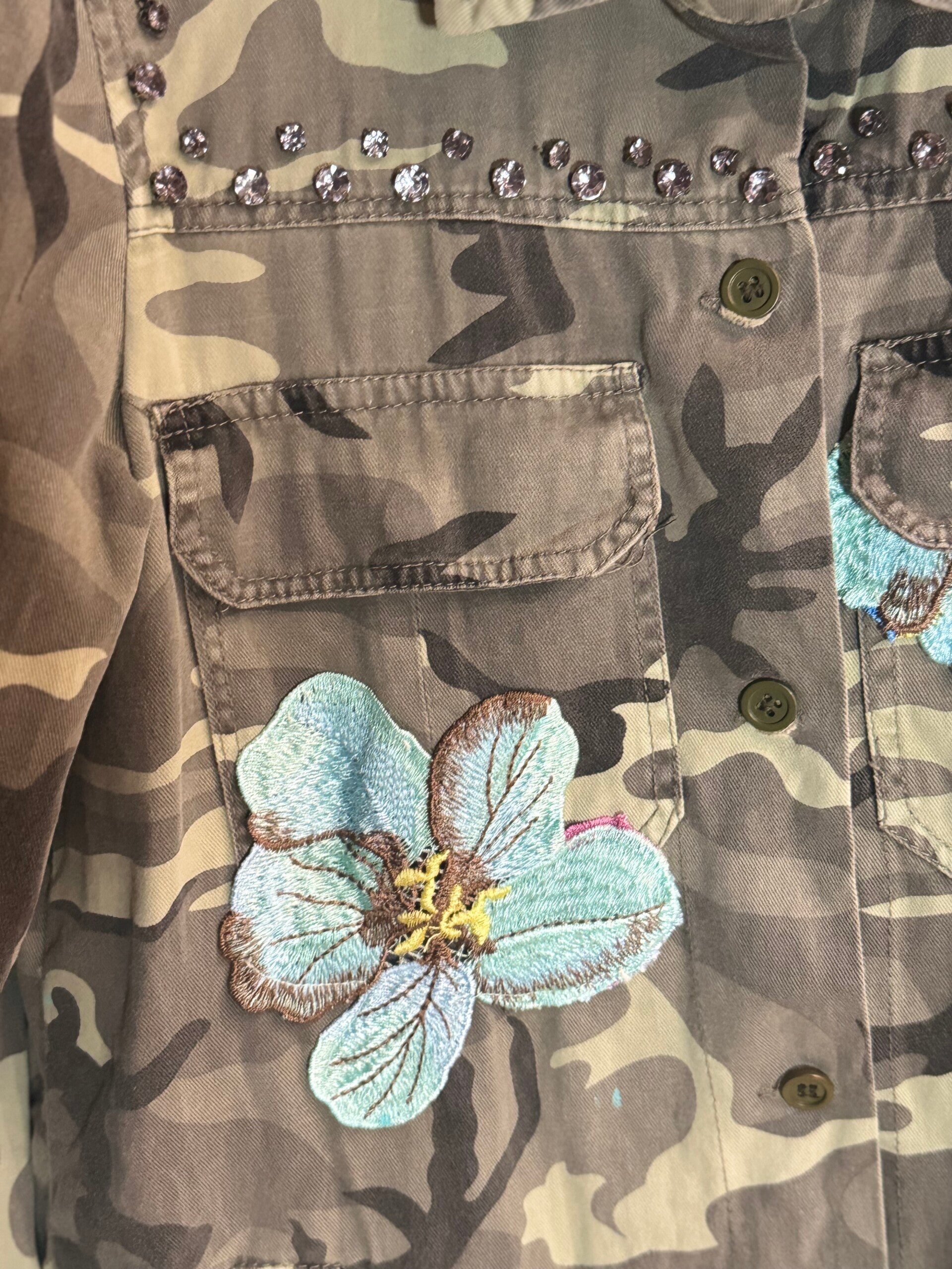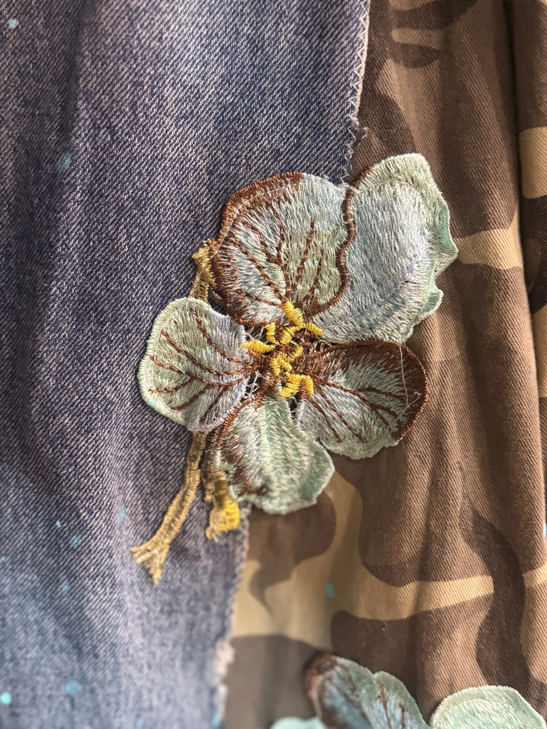 Giaccone militare vintage in fantasia camouflage, trasformato in un capo moda unico attraverso applicazioni denim, ricami floreali e dettagli artigianali che lo rendono un vero pezzo d’arte.