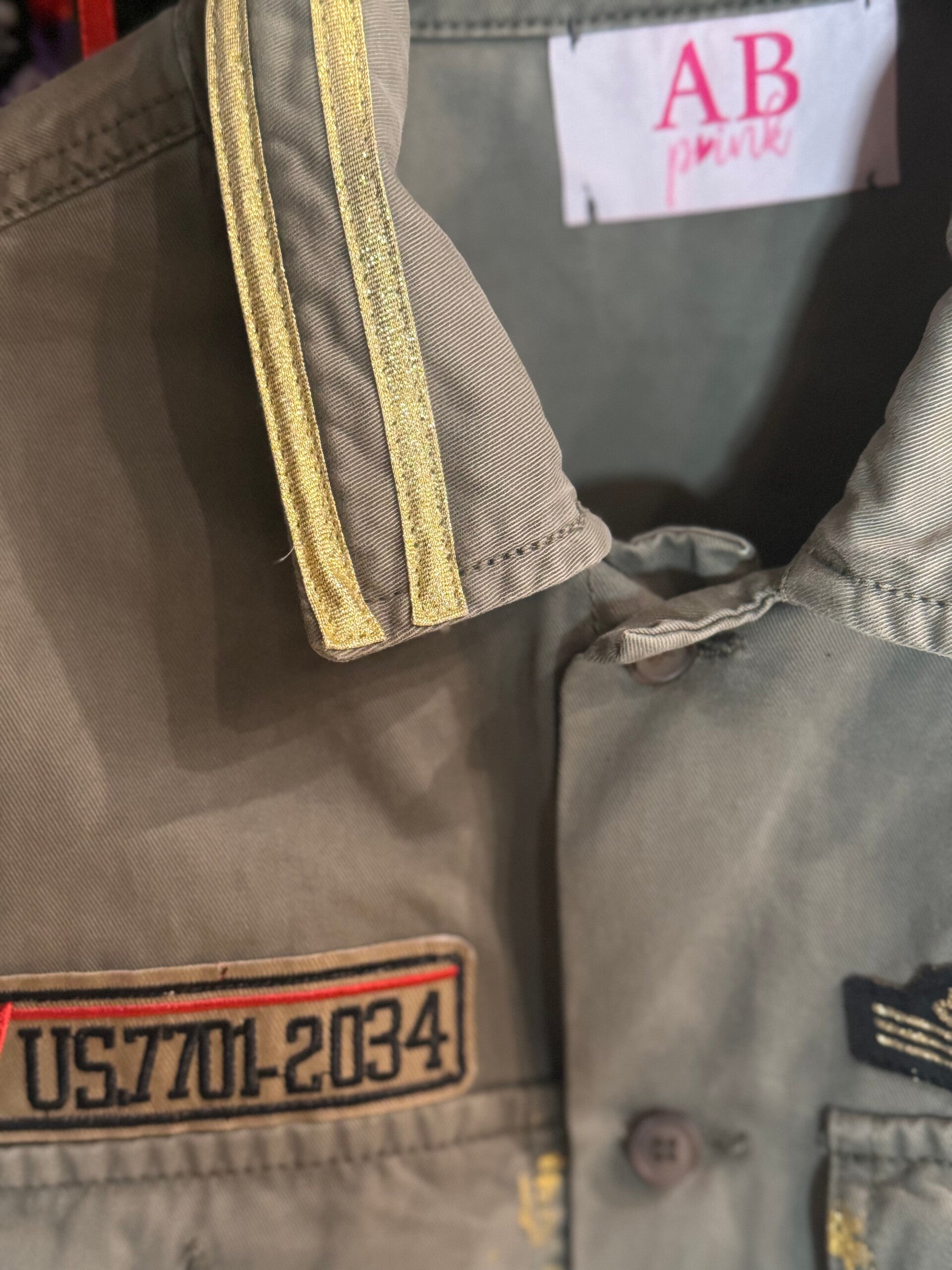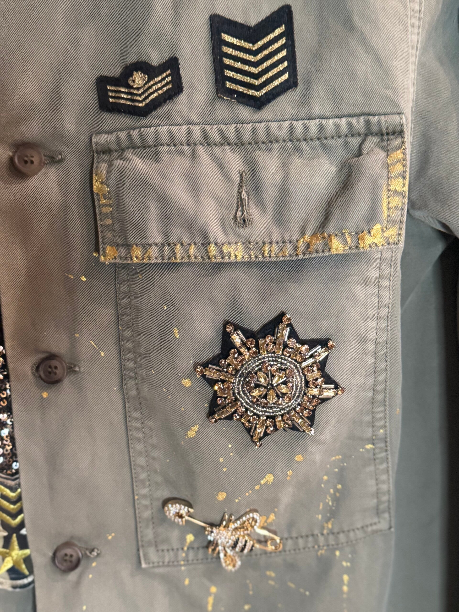Giaccone militare vintage completamente reinventato, arricchito da dettagli dorati, paillettes e applicazioni premium.