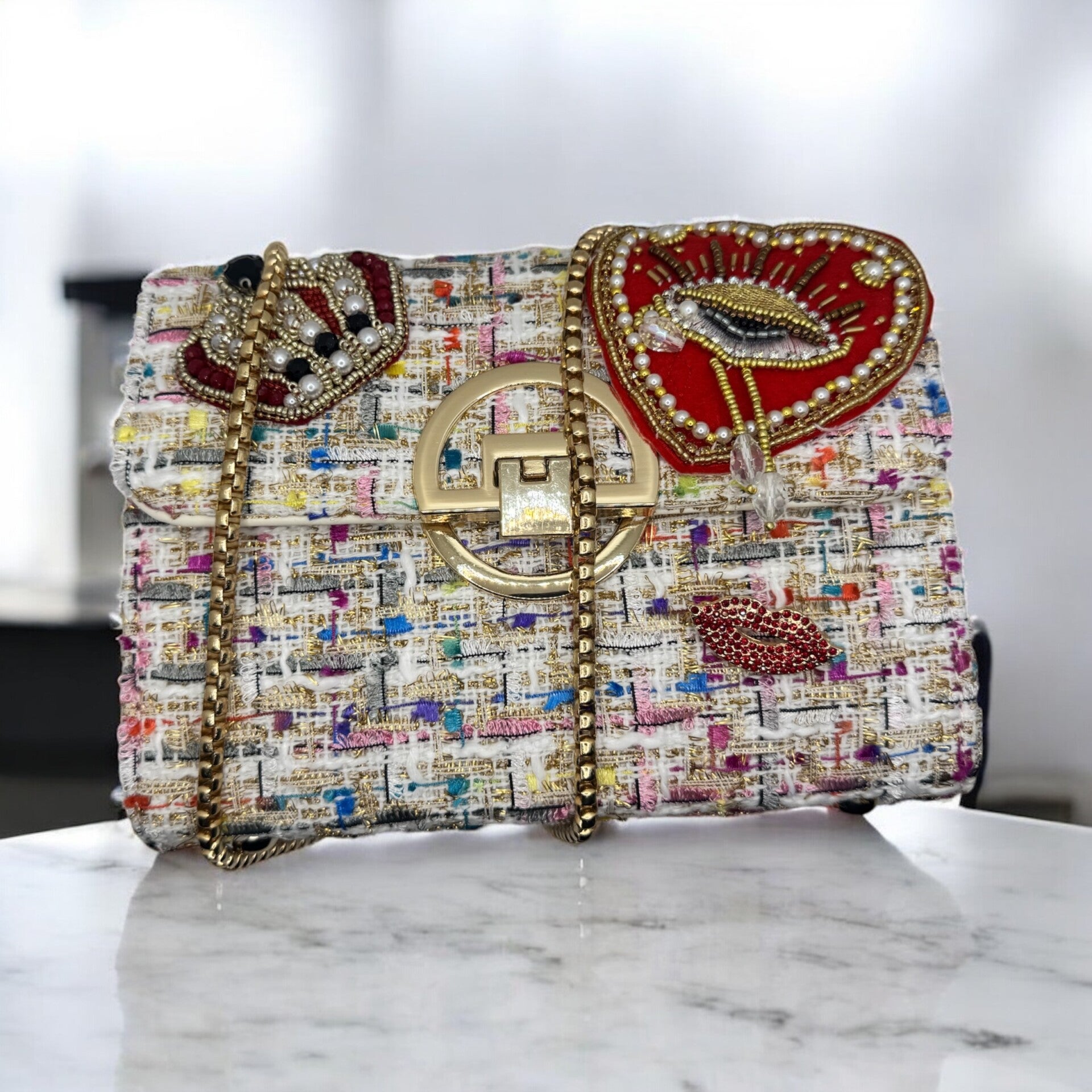Borsa couture in tweed multicolor con corona regale e cuore sacro ricamati a mano con perle e strass.