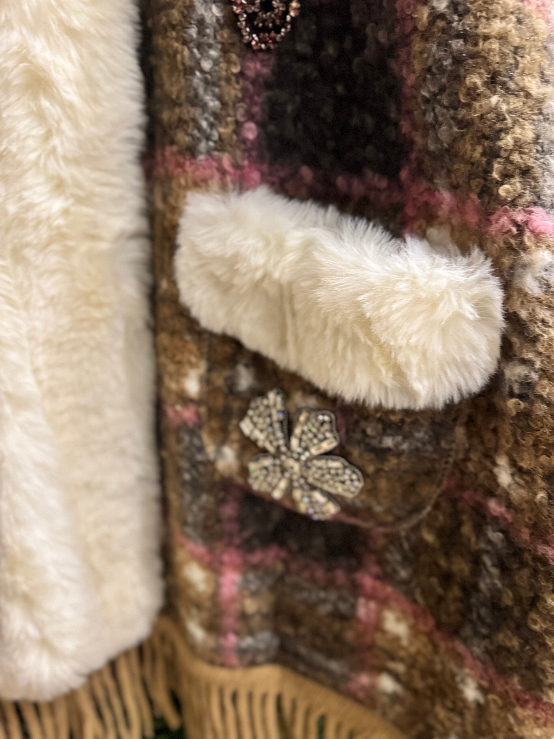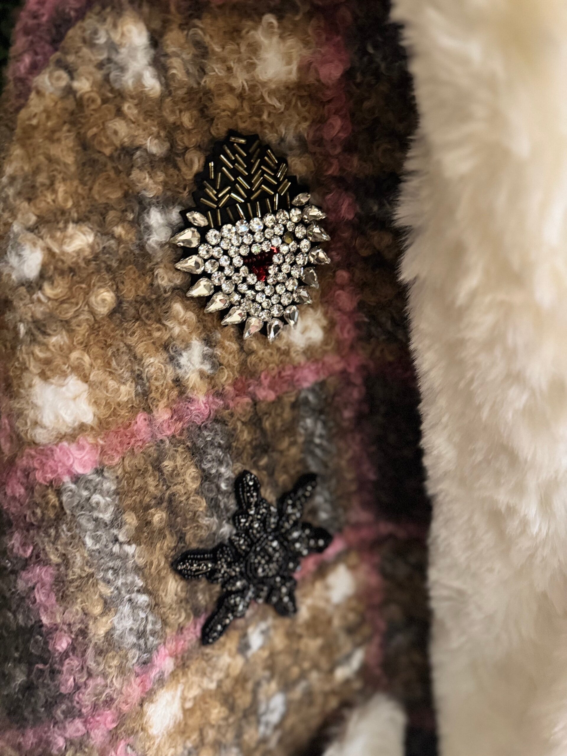 Realizzata in tessuto effetto lana bouclé a motivo check nei toni caldi del marrone, rosa e panna, è arricchita da inserti in eco-pelliccia morbida su collo, tasche e polsi, per un comfort avvolgente e super glamour.