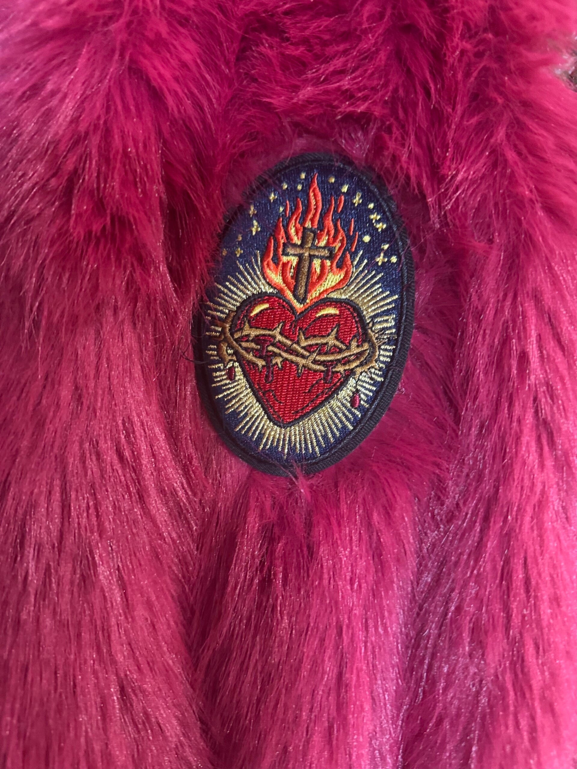 I patch decorativi applicati – stemmi, ricami floreali, cuore sacro e dettagli sparkling con catene – raccontano l’anima AB Pink: romantica ma strong, glamour ma fuori dagli schemi.