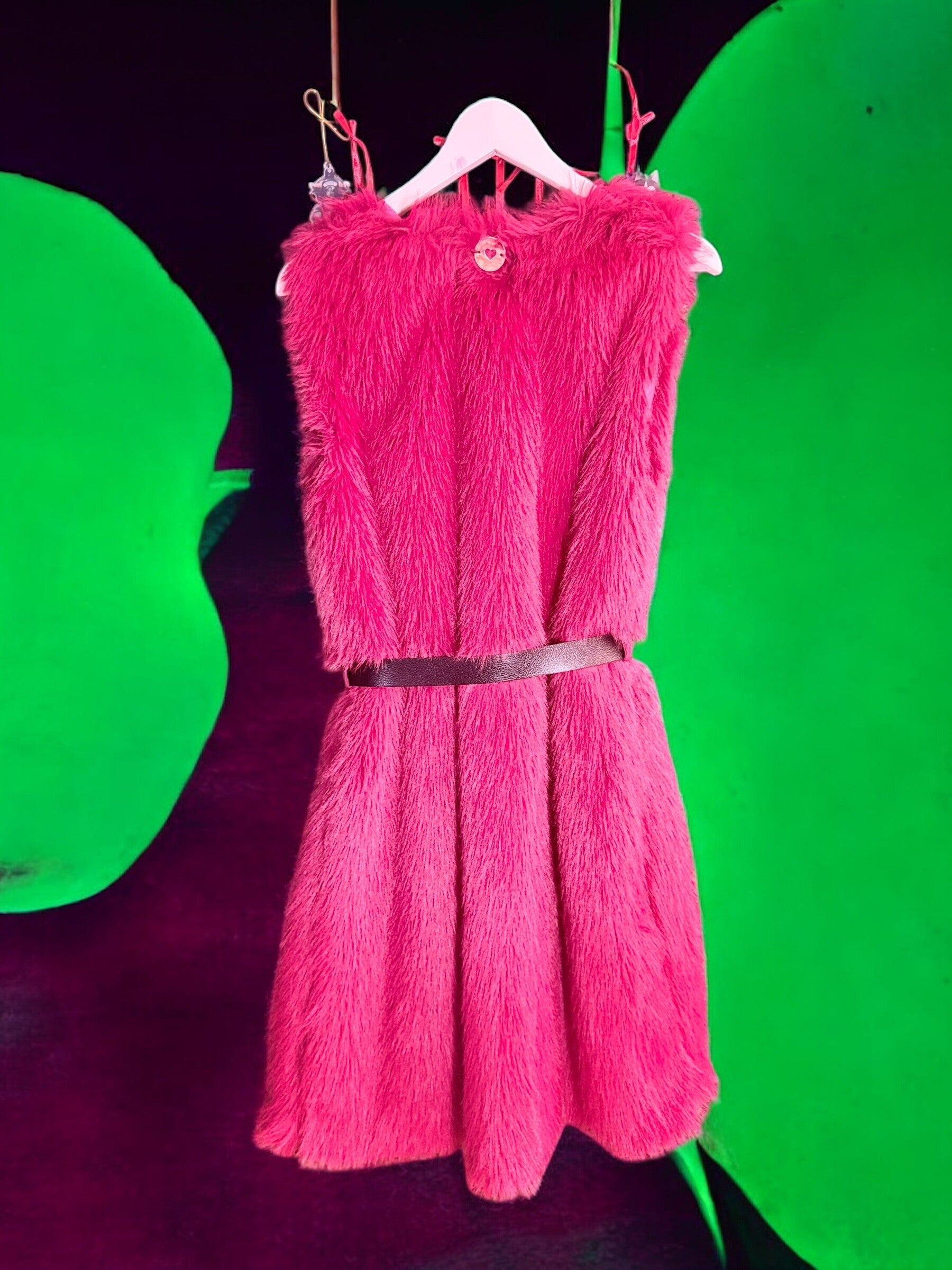 Realizzato in eco pelliccia soft touch, dal colore fucsia intenso e vibrante, presenta una linea smanicata con cintura in vita che valorizza la silhouette e permette di indossarlo sia aperto che chiuso, adattandosi a diversi look.