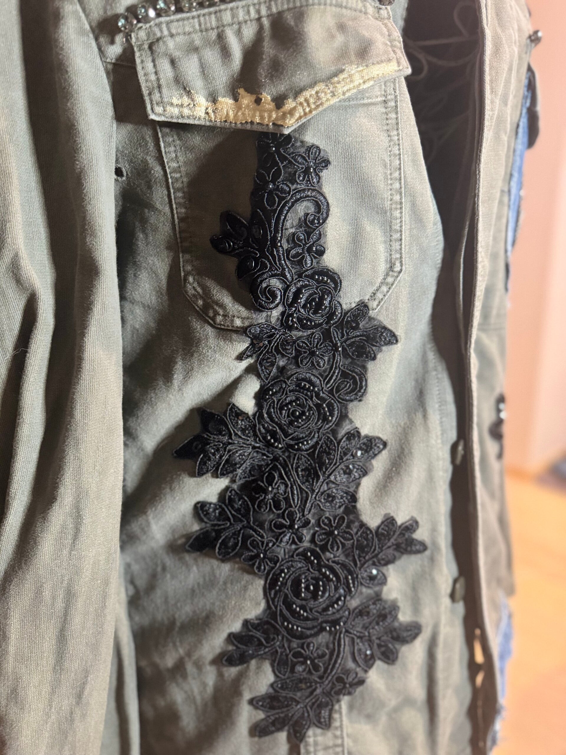 Il verde militare incontra inserti in denim vintage, applicazioni tessili e ricami artigianali che trasformano un capo iconico in una creazione unica.