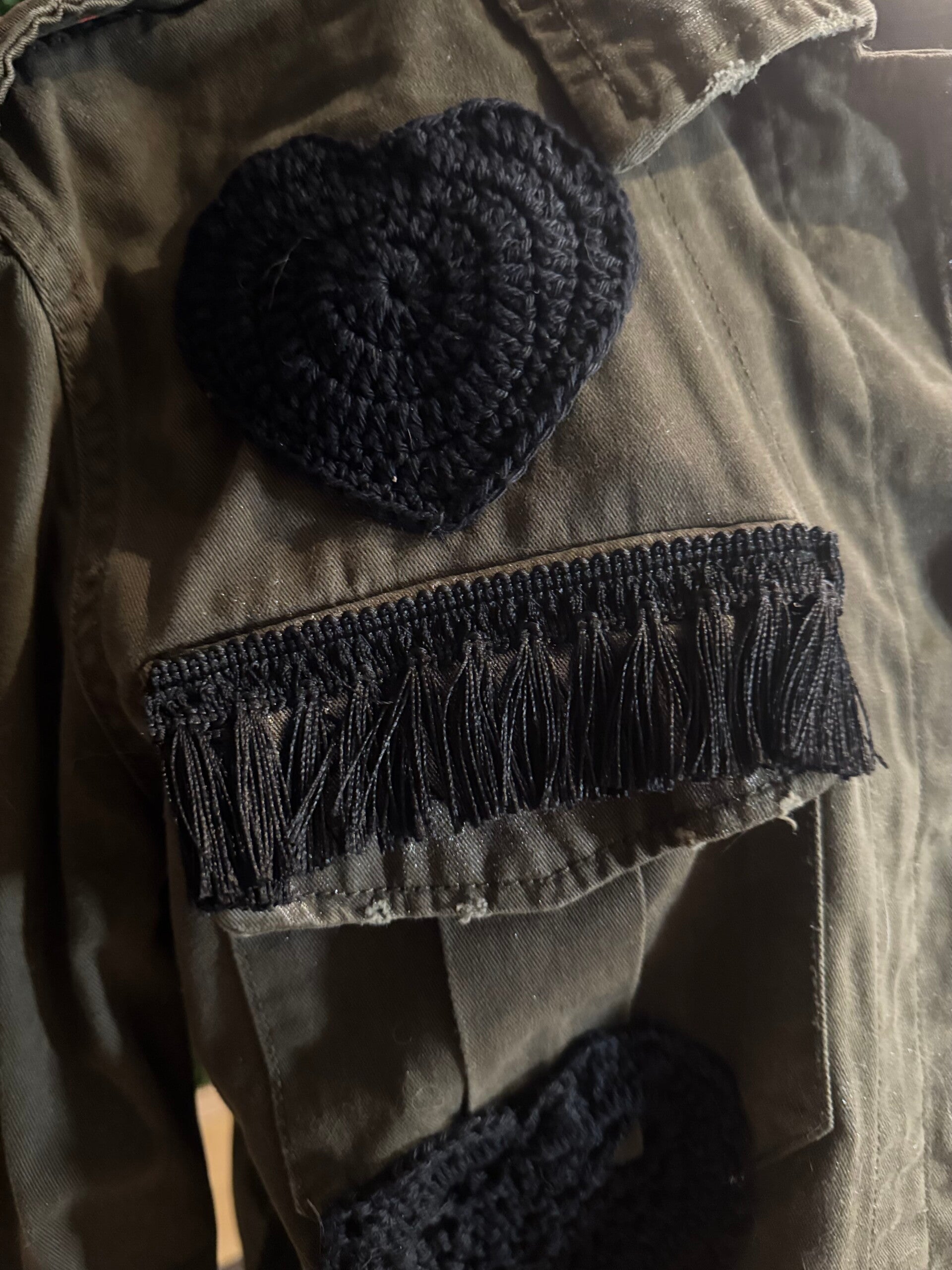 Il verde militare incontra dettagli neri intensi e applicazioni artigianali che trasformano il capo in una composizione visiva forte e contemporanea.