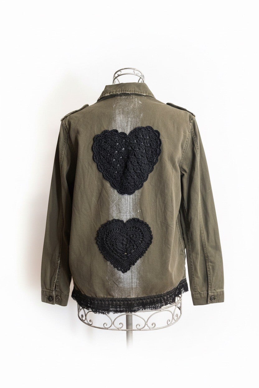 Sul retro, due grandi cuori neri realizzati a mano diventano il simbolo della giacca: un segno grafico potente che racconta emozione, forza e identità.
