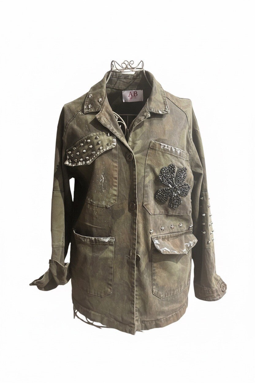 Il tessuto camouflage diventa la base di una composizione forte e contemporanea: borchie metalliche, dettagli artigianali e applicazioni decorative trasformano la giacca in un capo con identità decisa.